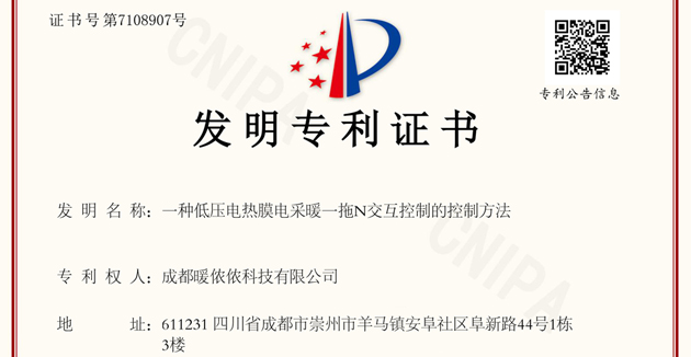 在科技日新月異、競爭激烈的當今時代,創新成為了企業發展的核心驅動力。2024年6月18日,成都暖儂儂科技有限公司歷時兩年多的時間,成功獲得國家知識產權局一項發明專利授權:一種低壓電熱膜電采暖一拖N交互控制的控制方法(專利號ZL 2021 1 1224805.0)。