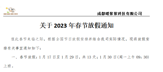 值此春節來臨之際,根據全國節日放假安排并結合我司實際情況,成都暖儂儂科技有限公司2023年春節放假時間:1月17日至1月29日,共13天;1月30日(周一上午09:30)上班。