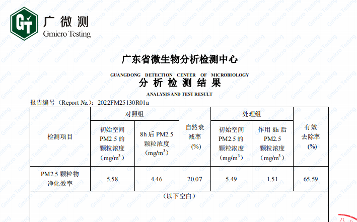 成都暖儂儂科技有限公司于2022年12月29日收到廣東省生物分析檢測中心簽發(fā)的【PM2.5顆粒物凈化效率】分析檢測報(bào)告,報(bào)告顯示:暖儂儂開啟狀態(tài)8小時(shí)后,測試空間的PM2.5顆粒濃度由5.49mg/m3降至1.51mg/m3,除去自然衰減率后,PM2.5顆粒物有效去除率高達(dá)65.59%,能降低室內(nèi)PM2.5顆粒物。